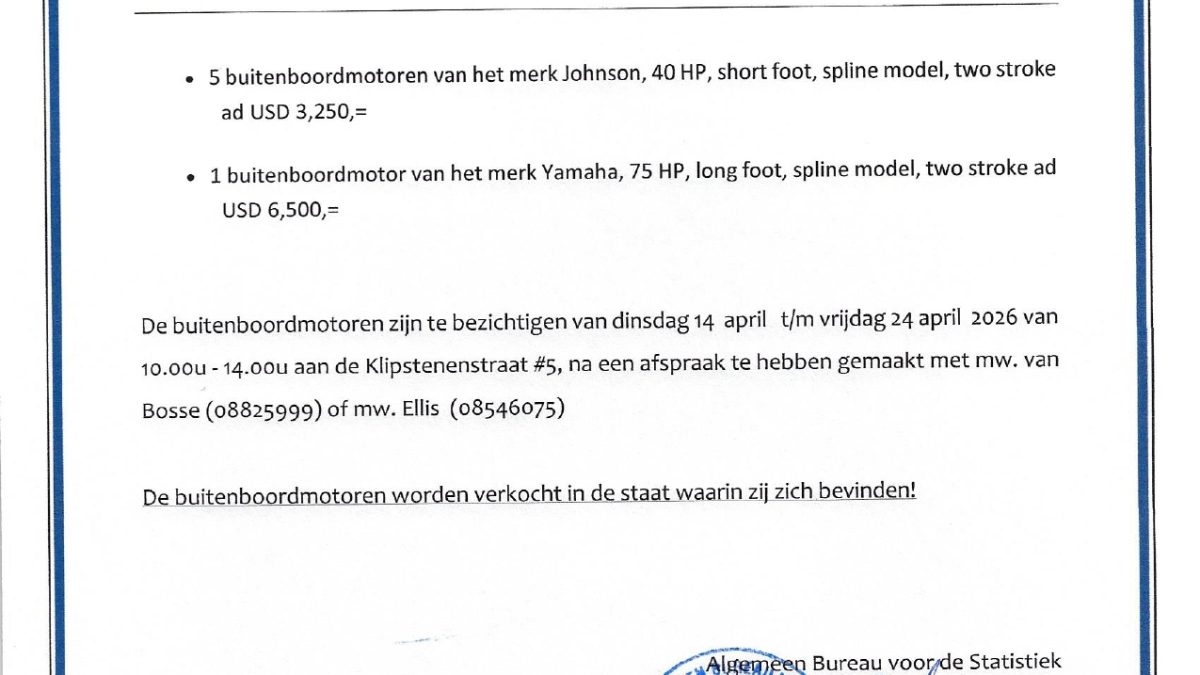 ๐๐ ๐ค๐จ๐จ๐ฉ ๐๐๐ง๐ ๐๐๐จ๐๐๐ง ๐๐จ๐จ๐ซ ๐ก๐๐ญ ๐๐๐: ๐๐ฎ๐ข๐ญ๐๐ง๐๐จ๐จ๐ซ๐๐ฆ๐จ๐ญ๐จ๐ซ๐๐ง. Geรฏnteresseerden kunnen de motoren bezichtigen op afspraak. | Klipstenenstraat #5 | 9 t/m 17 april 2026 | 10.00u โ 14.00u | Contactpersonen: mw. van Bosse 08825999 of mw. Ellis 08546075 Related postsMarch 25, 2026REQUEST FOR EXPRESSIONS OF INTEREST (EOI) FOR CONSULTING SERVICES (CONSULTING FIRMS) – Human Resources Management Consultancy for the General Bureau of Statistics (GBS)Read moreDecember 24, 2025Bekendmaking: ABS aangepaste openingstijden!Read moreDecember 10, 2025Dankzegging!Read more