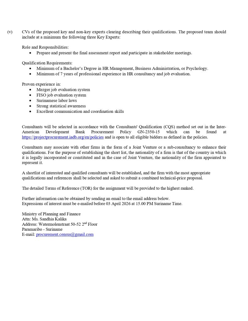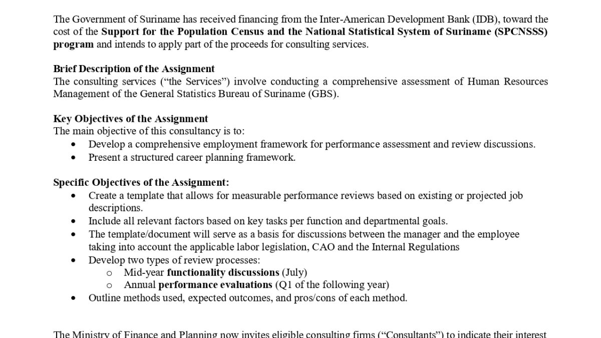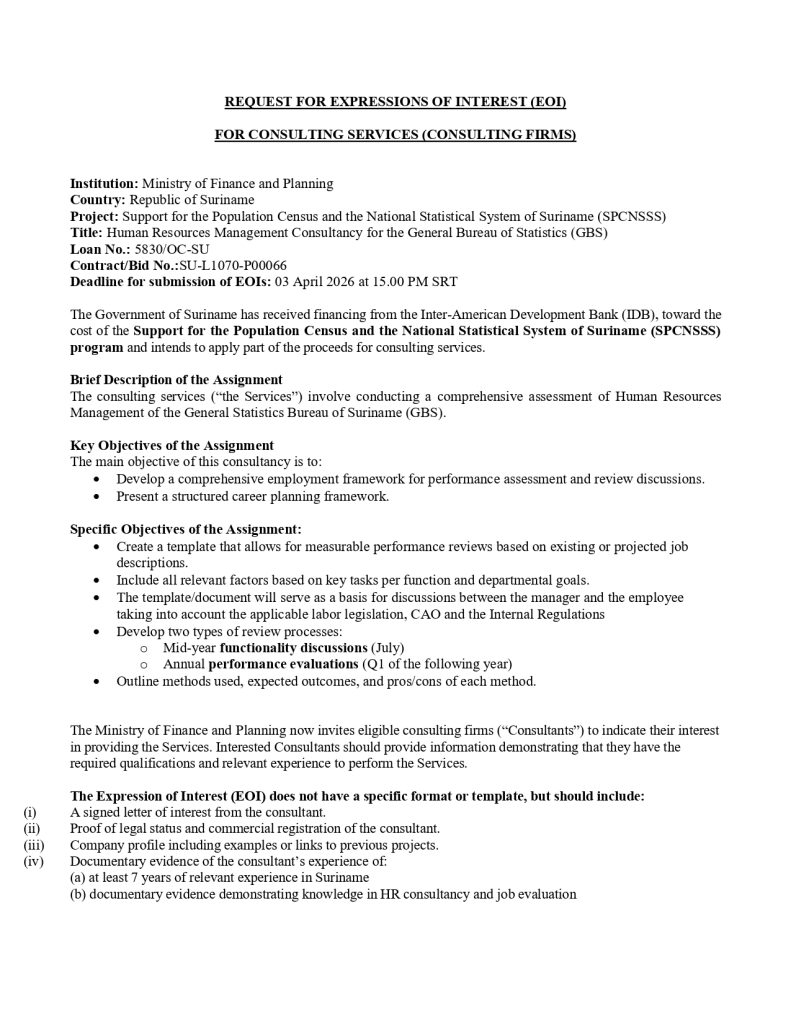 Read more about the REQUEST FOR EXPRESSIONS OF INTEREST (EOI) FOR CONSULTING SERVICES (CONSULTING FIRMS) – Human Resources Management Consultancy for the General Bureau of Statistics (GBS) Related postsDecember 24, 2025Bekendmaking: ABS aangepaste openingstijden!Read moreDecember 10, 2025Dankzegging!Read moreNovember 20, 2025SU-L1070-GBS Technical Assessment_REOI – Technical Assessment of GBS Buildings in Paramaribo, Nickerie and CommewijneRead more